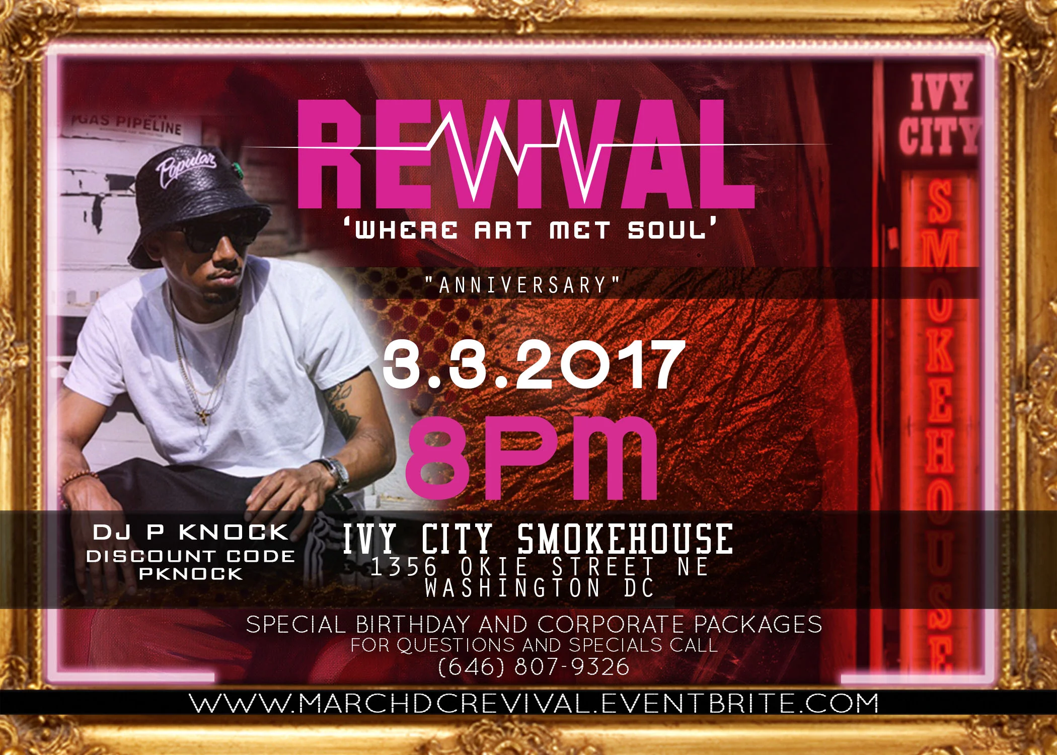 Revival is The Premiere Variety Show in the Mid Atlantic that highlights local talents and national acts! This event takes place every first Friday in Washington, DC at Ivy City Smokehouse. Join us for comedy, visual art, poetry, live music, and fashion! You can also enjoy a nice drink or two and dinner. Revival also offers special packages for birthdays, corporate outings, and large parties. For questions about the event or special deals call (646) 807-9326 or email wgcrevival@gmail.com. It's a celebration and we can't wait to see you there!