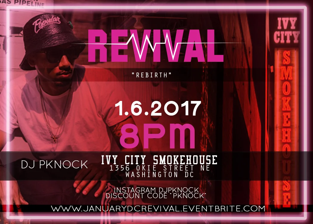 IVY CITY SMOKEHOUSE (map) 1356 Okie Street Northeast Washington, DC, 20002 United States ✚ gCal ✚ iCal View fullsize REVIVAL DC#REBIRTHJAN 6, 2017Revival is back!! At a new location Ivy City SmokehouseGet your tickets HEREGet your discount, when you use the code "PKNOCK"