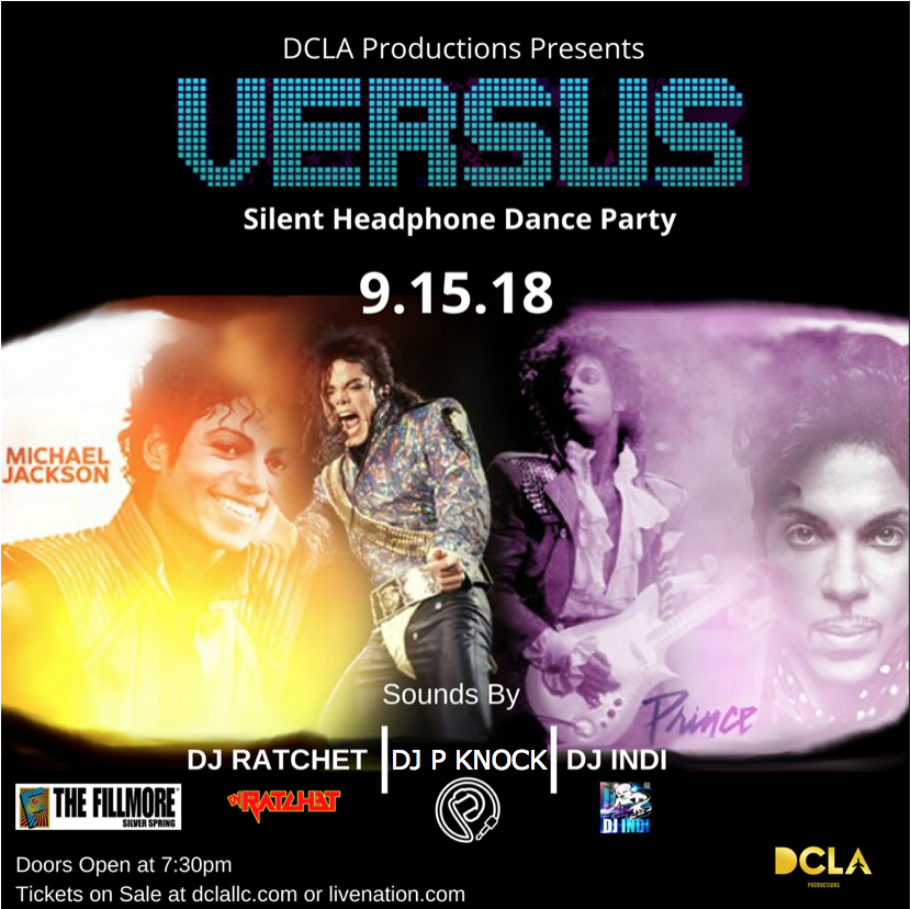 THE FiLLMORE (map) 8656 Colesville Road Silver Spring, MD, 20910 United States ✚ gCal ✚ iCal View fullsize DCLA PRODUCTiONS PRESENTS . . .SiLENT DANCE PARTY9・15・18 . . . PRiNCE x MiCHAEL JACKSON . . .